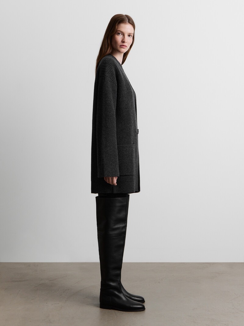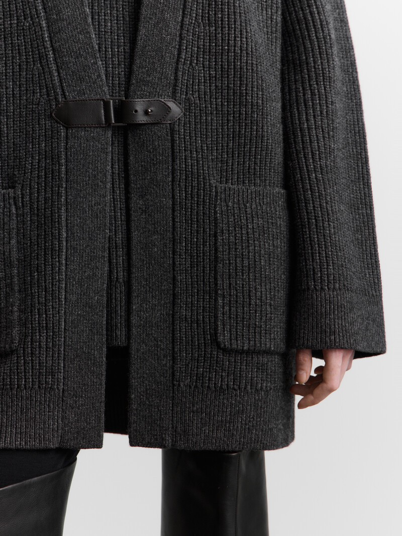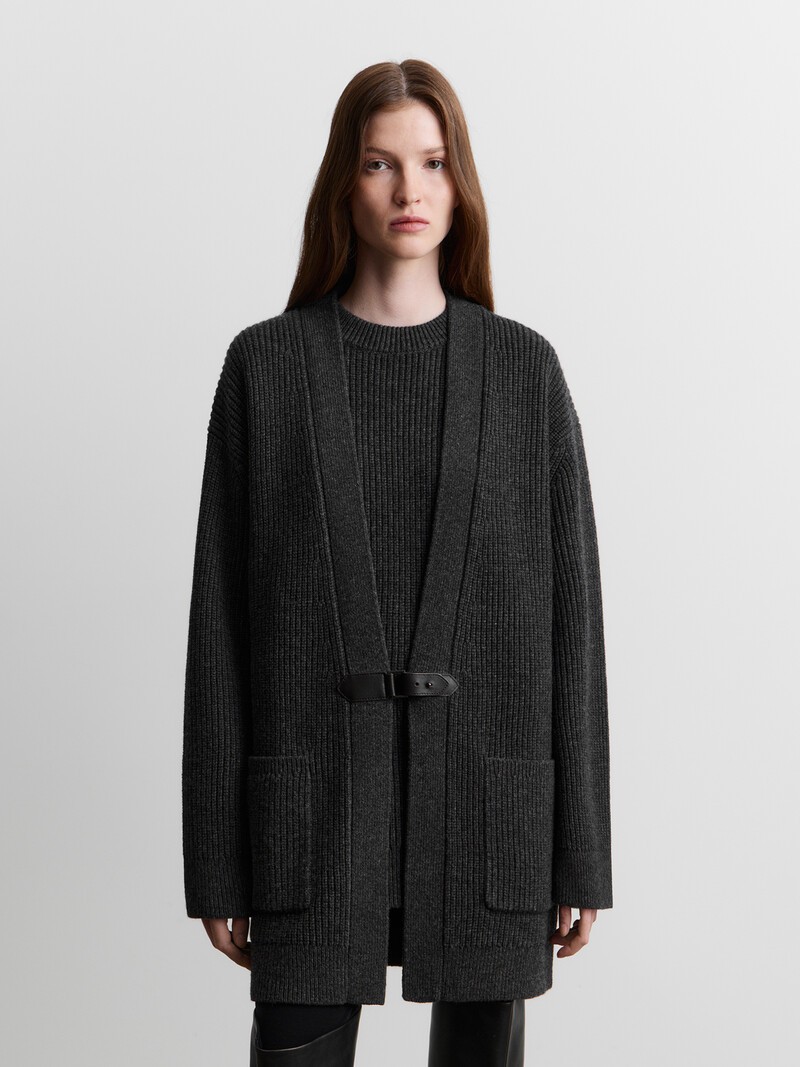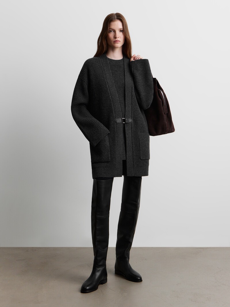 Удлиненный кардиган, который заменит пальто в осенние дни и согреет зимой. Он связан объемной французской резинкой из очень мягкой мериносовой шерсти и дополнен ремешком из натуральной кожи с металлической пряжкой.